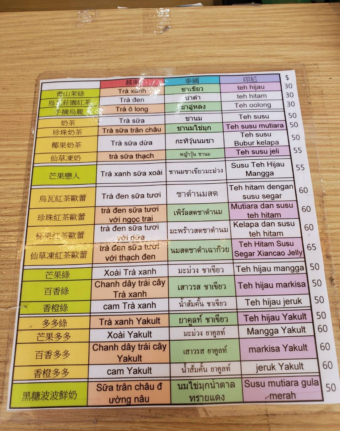 搖搖杯盛行,也受到觀光客或居住在台灣的外國人喜歡。某次出差路上買飲料時看到這張,店員說常有東南亞顧客,臨時做了這張Menu貼在櫃檯上。做生意八方來財,行銷「溝通」很重要,要能「換位思考」瞭解你的顧客。@chen